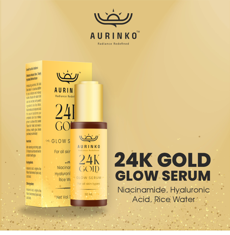 Aurinko 24K Gold Glow Serum is a premium, multi-purpose skincare essential designed to bring out the natural radiance of your skin. This luxurious serum is enriched with real 24K Gold Leaf, a potent ingredient known for its ability to illuminate and rejuvenate dull, tired skin. Combined with skin-enhancing ingredients like Niacinamide, Mulberry Extract, and Hyaluronic Acid, this powerful formulation delivers deep hydration, refines texture, and promotes a healthy, glowing complexion.